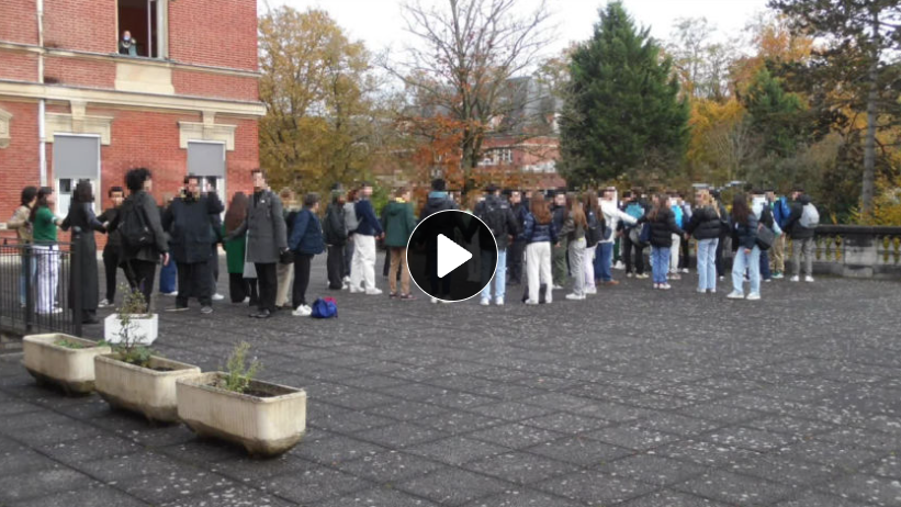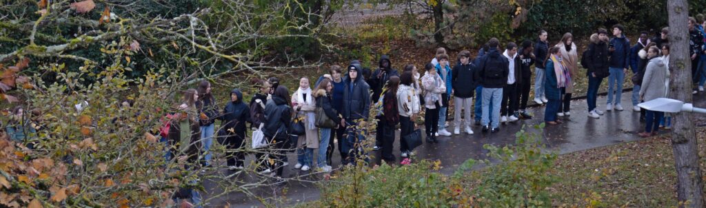 En fin d’heure, les élèves, leurs enseignants sont descendus des divers bâtiments du campus, dans le calme accompagnés de tous les personnels du lycée . Tout le monde s’est placé dans le parc avec l’aide des délégués et des élèves du CVL, et le concours des enseignants, tous impliqués dans l’action.